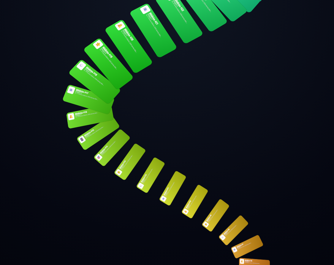 Kartlar (bildirim gibi düşünün) dikey bir spiral üzerinde dizili. Altta küçük ve sıkışık başlıyor, yukarı çıktıkça büyüyor, genişliyor ve renk gradyanıyla canlanıyor. Derinlik hissi veriyor, hafif wobble animasyonuyla da “Ben buradayım!” diyor.